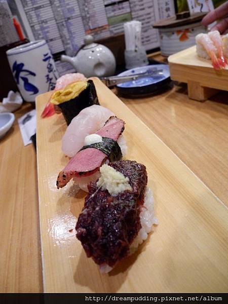 豪哥還點了鯨魚肉握壽司,是很奇異的靚色,但口感據說還好。