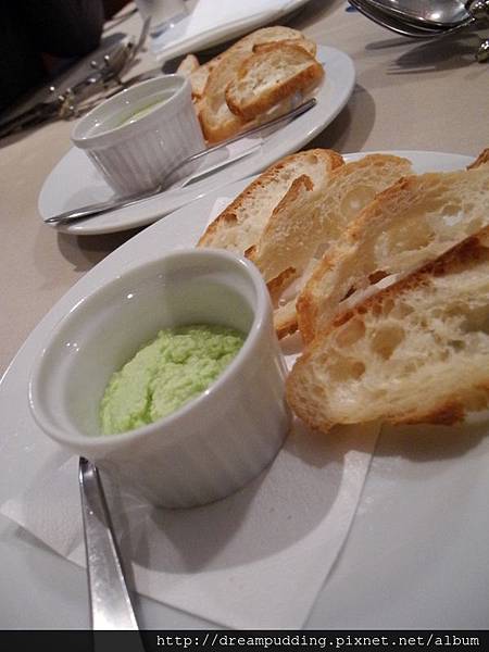 麵包蠻酥的,搭的是豌豆泥奶油,不敢吃豌豆泥的我一開始只敢挖一點點淺嚐,沒想到她沒有我害怕的豆味,嘗起來也清爽,所以後來也很努力在抹。