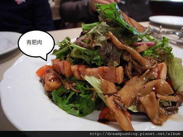 蕈菇培根沙拉,口味上比較重,是說這培根怎麼厚切得像三層。