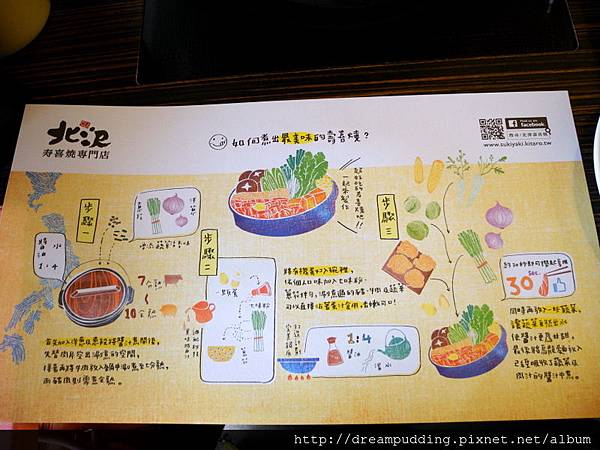 桌上的餐墊紙寫著該如何食用壽喜燒,建議先放洋蔥跟蔥段讓醬汁甜味更勝,再放肉進去涮涮樂。