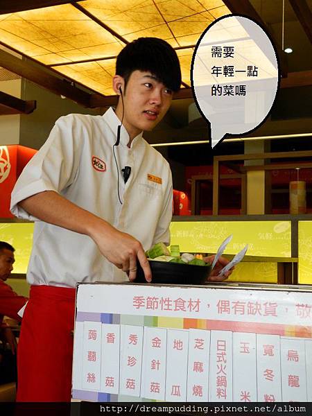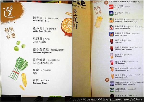 一開始服務生也會問主食,主食像是越光米跟冬粉及烏龍麵都是吃到飽的,還有青菜也是,飲料則是以杯換杯,一杯喝完了再跟服務生換別種口味。