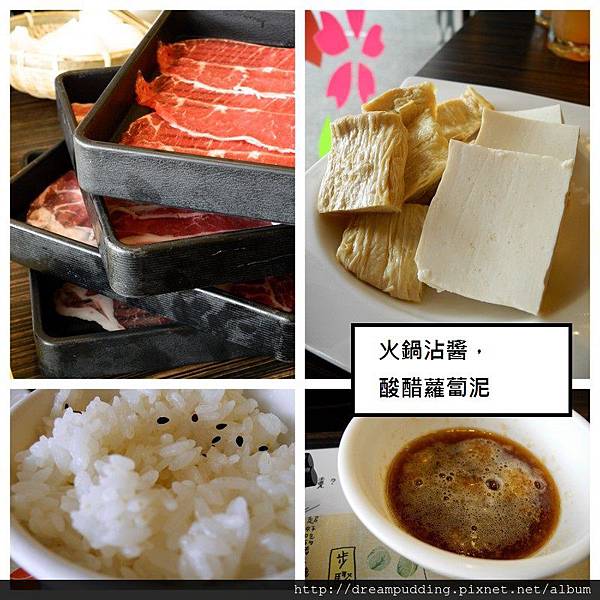 一開始會先送上4盤肉跟越光米飯還有豆腐跟腐皮,以及地獄辛口鍋的專屬清爽沾醬,醋酸蘿蔔泥,我愛甜,所以地獄鍋我就比較少吃,專攻甜甜的壽喜燒。