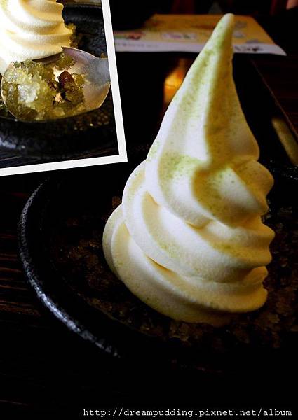 飯後甜點我點了抹茶刨冰冰淇淋,刨冰的顆粒有點粗,但裡面還藏著紅豆,香草口味的冰淇淋很濃滑。