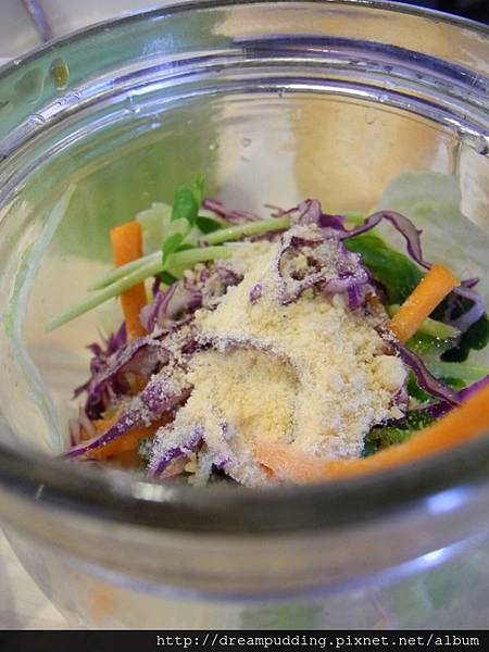 沙拉在密封罐裡,除了加入現有的油醋汁之外,還可去醬料櫃拿起司粉來撒,增添風味。