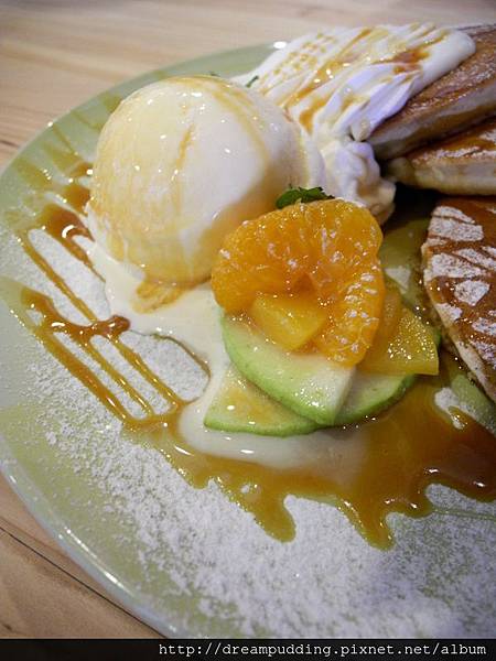 是說這個抹茶卡士達紅豆鬆煎餅整個深得我心啊,除了厚度夠之外,香氣也夠,口感不像小豚那樣是輕盈的,他比較濕潤,一層鮮奶油一層抹茶卡士達,苦甜交織融合,在配上一旁的抹茶冰淇淋,還有上面甜而不膩卻緊密的紅豆泥,跟原味的楓糖鬆餅相比,我比較偏心這個鬆餅。