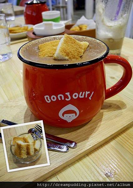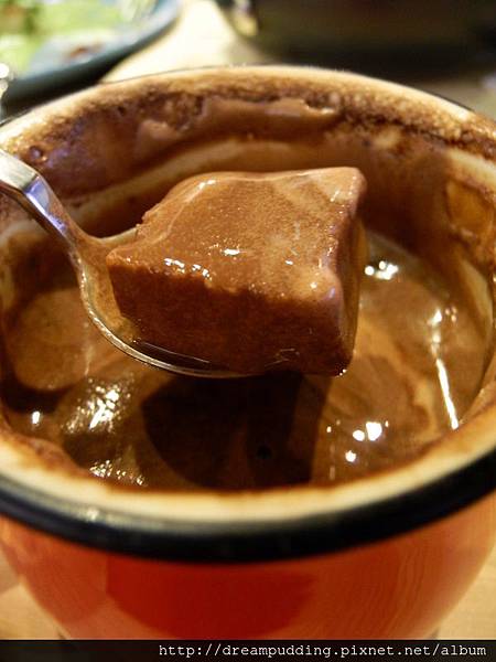 熱可可也很推,可可非常濃稠,配上麵包塊就很有巧克力鍋的感覺,讓我好想帶水果做巧克力水果鍋喔。