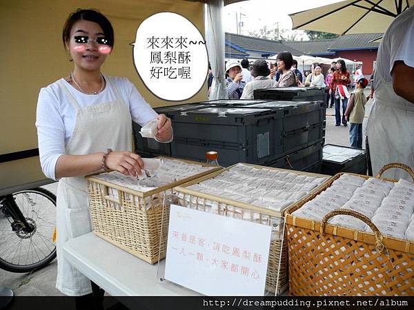 排隊進入三合院之後,服務人員會很熱心的一人發一整塊鳳梨酥給大家試吃,連小朋友跟嬰兒也會有喔,不過當然最後都是大人吃掉啦,哈哈。