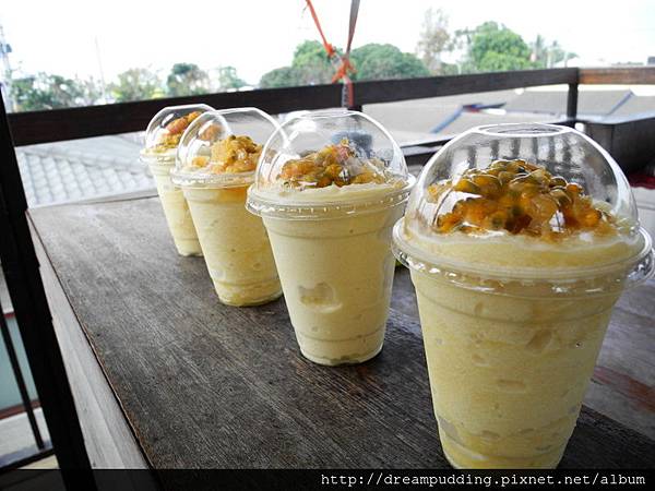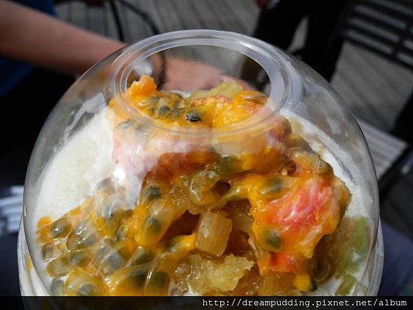 黃澄澄的鳳梨冰沙上面放了百香果、葡萄柚跟鳳梨果肉,料算多的,跟鳳梨冰沙混合之後,不會太甜,帶點回甘的酸,而果肉咬起來還挺過癮的。