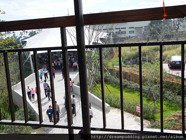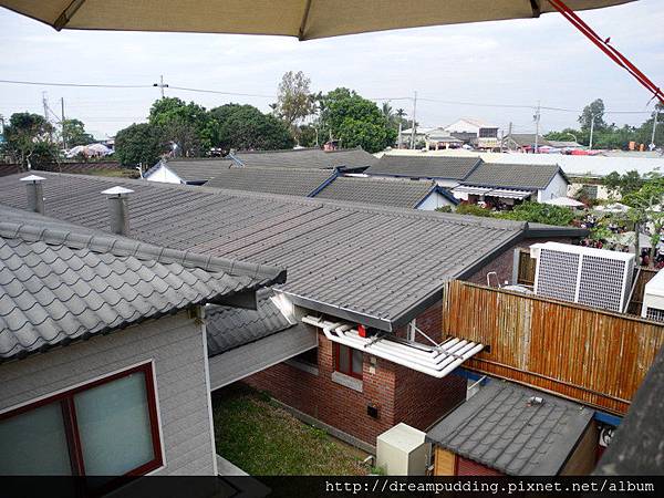在鳳梨冰沙販賣處的2樓可以看到不遠處的三合院屋瓦及底下的村民市集。