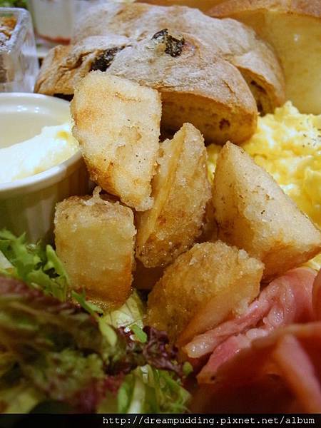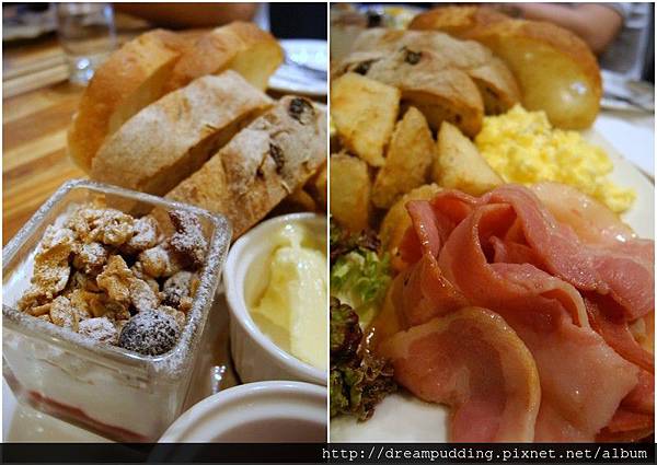 圖左後方的麵包好好吃,外酥內蓬鬆,單吃就很棒,也可以搭奶油或是果醬;圖左前方的是手工優格,酸的我就不愛了,如果是奶酪我一定立馬清空;圖右的培根給的分量很多,我喜歡這種炒的軟軟的培根,因為這樣才有吃肥肉的軟嫩感,但小花跟女神都比較喜歡煎的脆硬的培根。