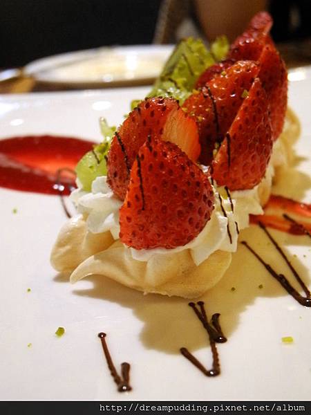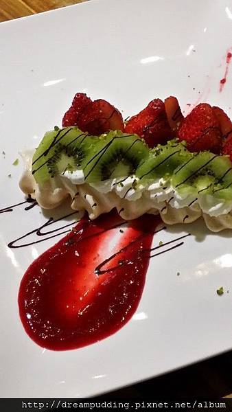 蛋白霜餅上面載滿著草莓跟奇異果。