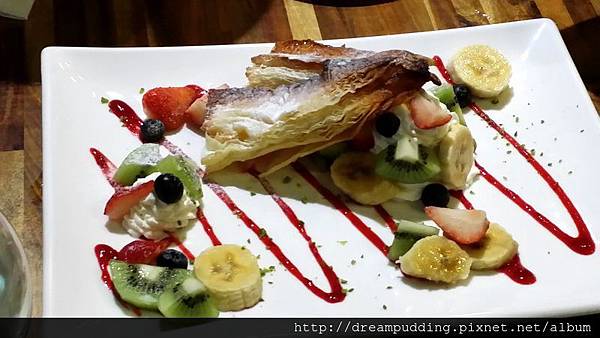 現烤手桿千層派佐新鮮水果奶油(需等候25分),NT220元+10%。
