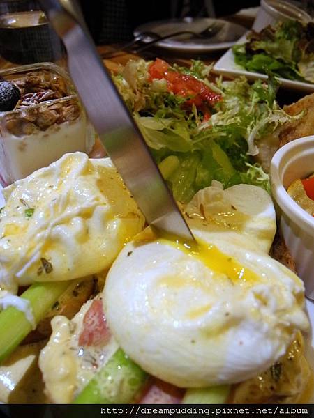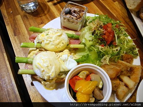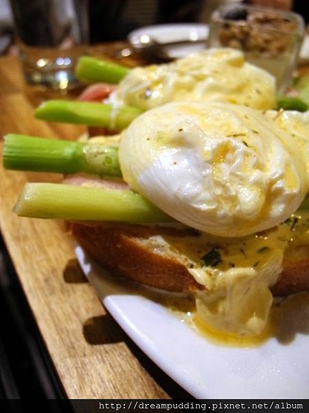 那個將熟未熟的蛋,一刀劃下讓蛋液跟底下的蘆筍、培根、麵包混在一塊吃,口感濕潤且溫和,好讚。