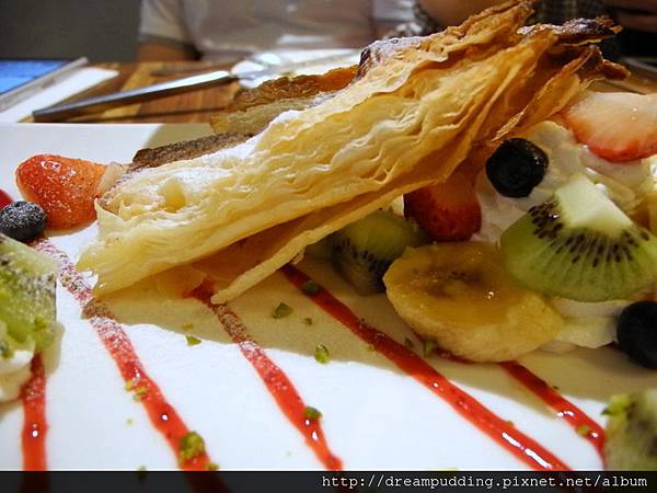 層次感很明顯,口感薄脆,單吃千層會略油,所以必須搭著水果跟輕盈爽口的奶油一塊吃,口感會很豐富,是說九月的鮮奶油口感輕盈卻不膩,很好吃阿。