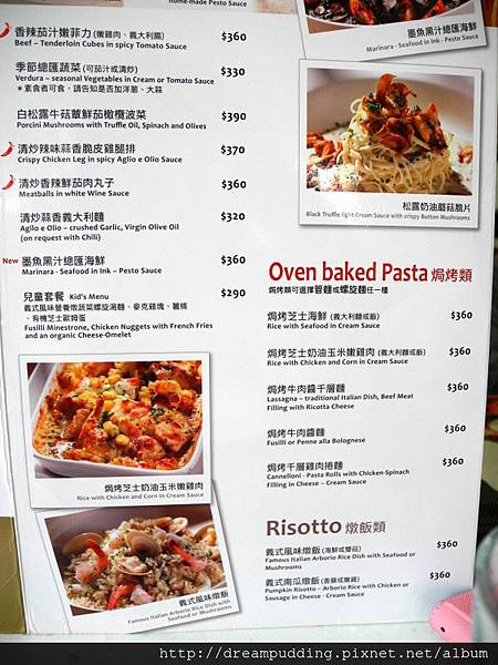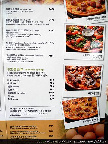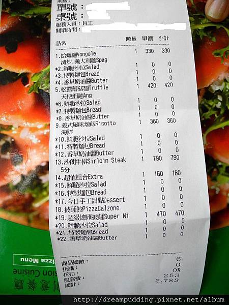 凡點麵類、披薩跟焗烤類均附沙拉及麵包。