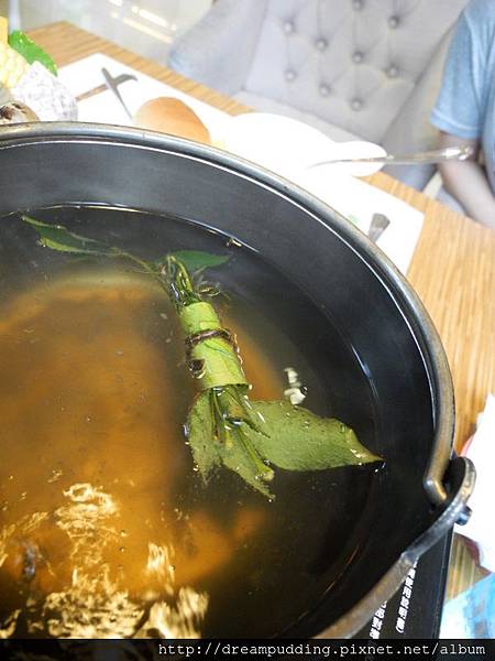 鮮採天然健康香草鍋,搭的是特選海鮮NT328元,裡面有一束香草就在精燉的高湯裡滾阿滾,湯頭喝起來清爽微甘,好適合正在減肥中的我,不過這一鍋不是我的,哈哈哈,謝謝RED幫我減肥。