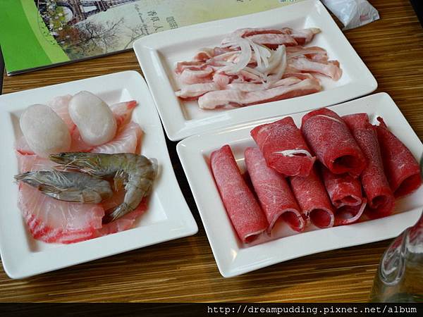 左邊的海鮮盤有鯛魚片跟兩顆大干貝還有大蝦;右上是雞腿肉切條,右下是牛肉片,肉片給的份量有足。