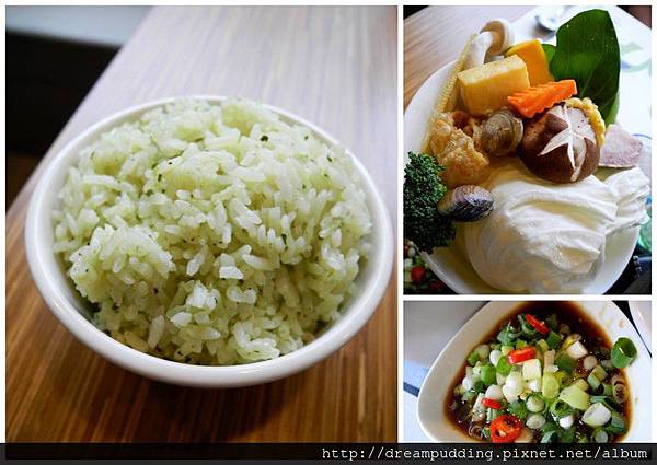 我很喜歡附的那一碗香草飯,口感自然帶有一絲清新,讓米飯更香了,米粒分明不緊密,好吃;而火鍋料也是滿滿的一大盅;沾醬有我最愛的滿滿的蔥,還有清爽的蘿蔔泥穿梭其中。