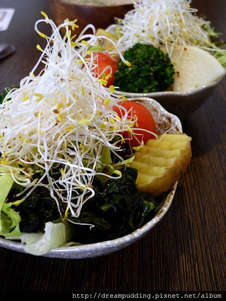 附餐沙拉,有生菜、海藻跟水果還有地瓜,營養豐富均衡的一碗,和風胡麻醬有點酸鹹的新鮮好吃。