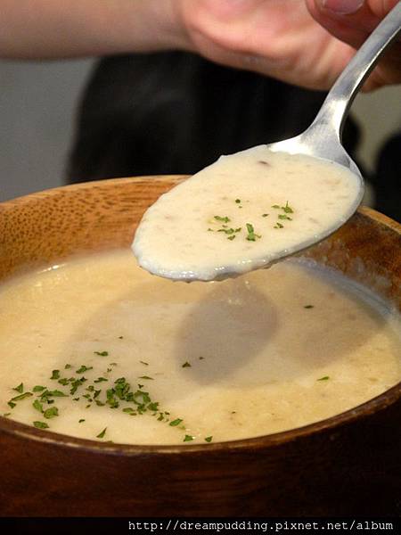 好像是芋頭濃湯,很濃,還嚐的到細碎的小顆粒,我覺得口感有點像鹹粥,有飽足感,喝完就飽的差不多了。
