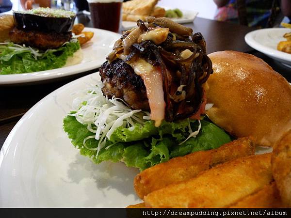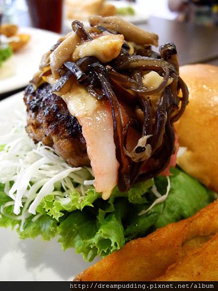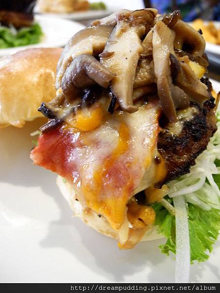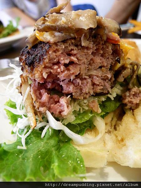 小顆卻扎實的漢堡肉丸上面疊疊層層的放了起士跟木耳還有野菇。