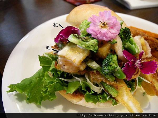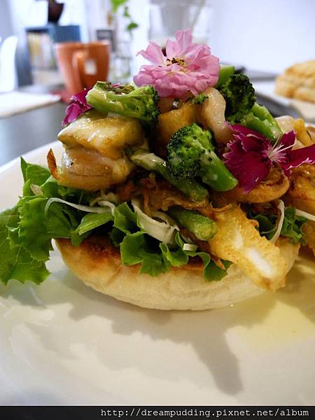 看起來超美的花花堡是海鮮口味來著,搭配青花奶油醬跟花枝天婦羅還有食用花朵。