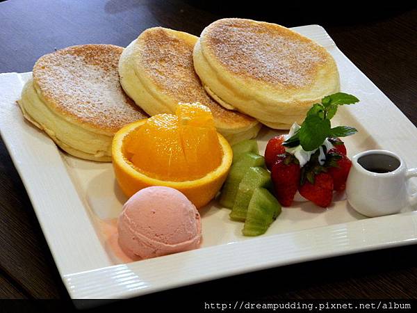 季節旬果鬆餅,除了切好的水果還有附上一球明治冰淇淋。