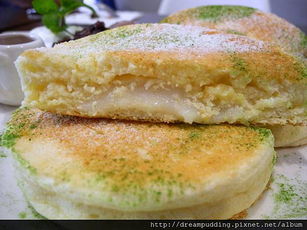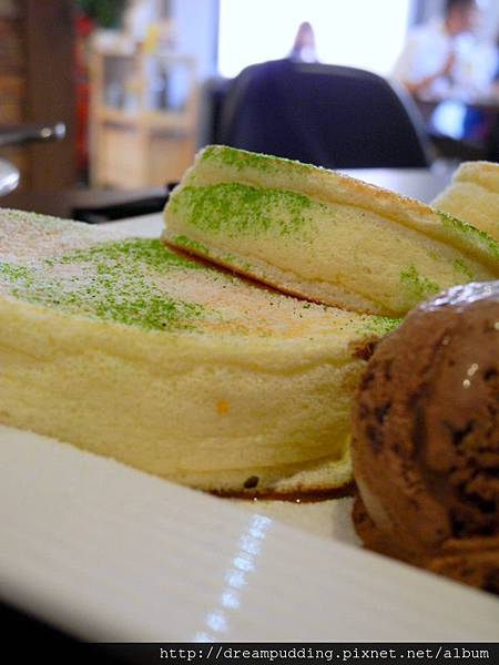 鬆餅也灑上了抹茶粉,我有沾著旁邊的巧克力冰淇淋吃,覺得還是單吃比較好吃。