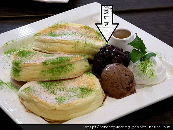 紅豆抹茶白玉冰淇淋鬆餅,MENU上寫的是抹茶冰淇淋,不知道來的為什麼是巧克力冰淇淋,巧克力跟紅豆還有模茶感覺比較不搭。