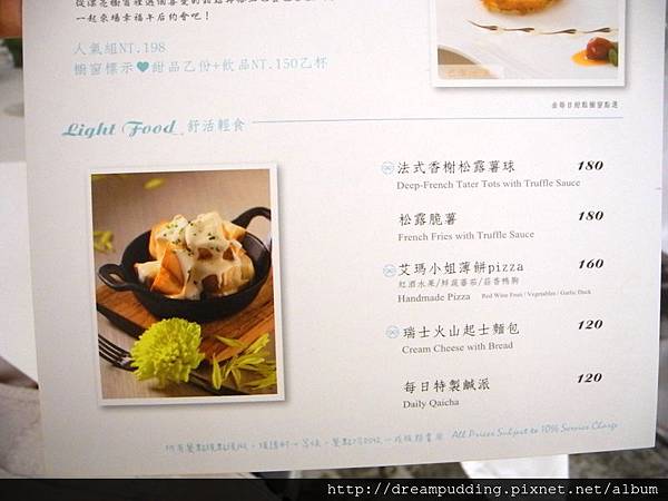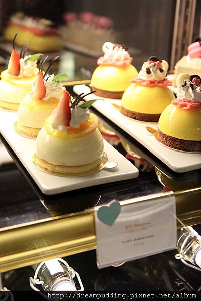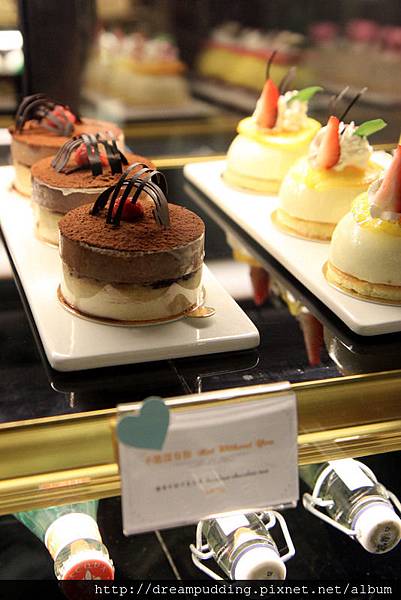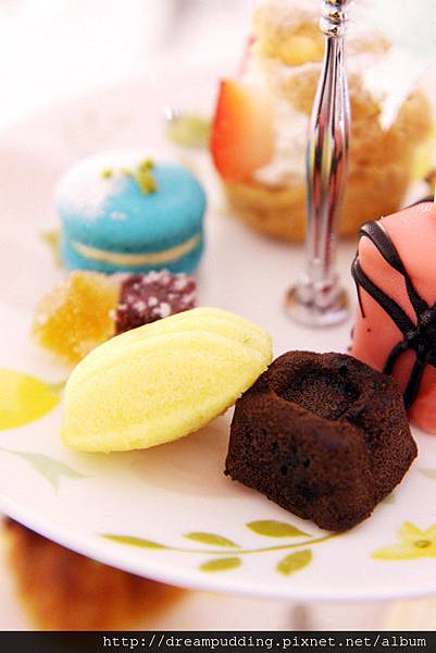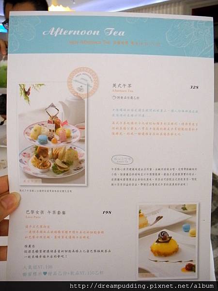 我們點了一份英式午茶跟一份巴黎女孩午茶套餐,都各附一杯飲料。英式午茶是圖左上的繽紛茶點;巴黎女孩則是到櫥窗挑選一份蛋糕再附一杯150元飲品,超過補差額。