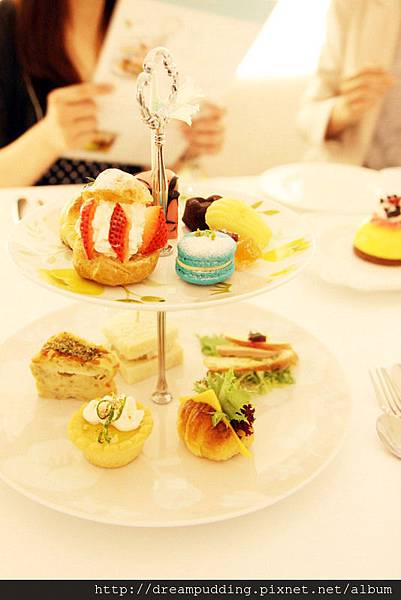 我們的英式午茶來了,下方放的都是鹹點,上方才是甜點,先從鹹點開始吃起,服務人員有建議,下午茶系列配茶類比較不會甜膩,所以我都一直喝小朵的櫻桃煎茶,後來吃飽後才開始喝我的抹茶歐蕾