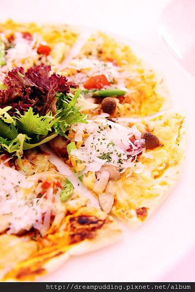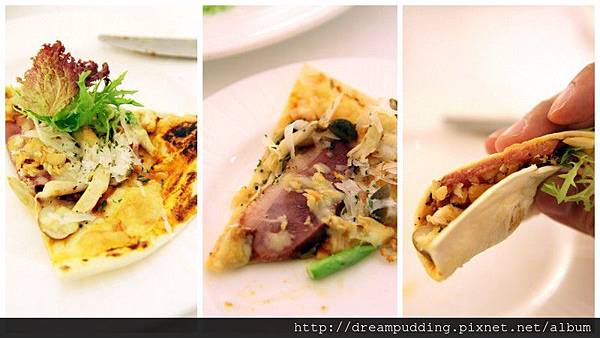 薄餅的邊邊帶脆,接近中心的內部帶嚼勁,裡面有放了整片鴨胸肉還有蔬菜跟起士還有脆甜的菇類,整體起吃來有蒜香環繞,脆甜鹹交錯的,很好吃,很推~。