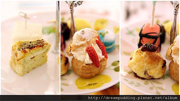圖左邊上面灑香料的是馬鈴薯、鮮奶、鮮奶油製成的鹹蛋糕,口感比較扎實且緊,略乾,記得配上茶,是說下午茶本來就要配茶了。中間的是小泡芙,還夾了鮮奶油跟小草莓果肉,最右的則是蔓越莓司康,下午茶就是要有扎實的司康出現阿!