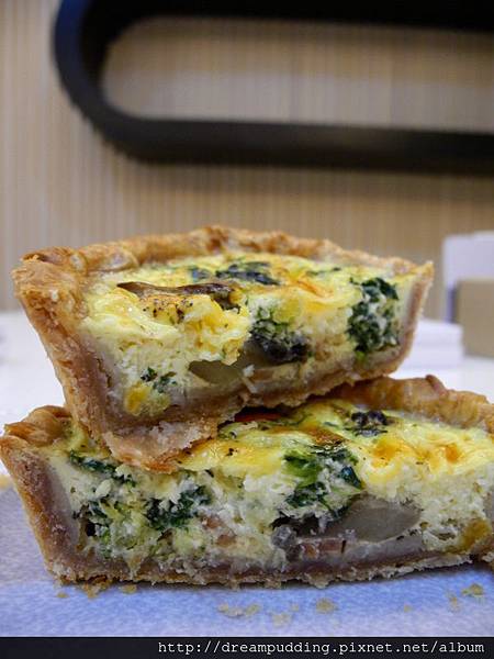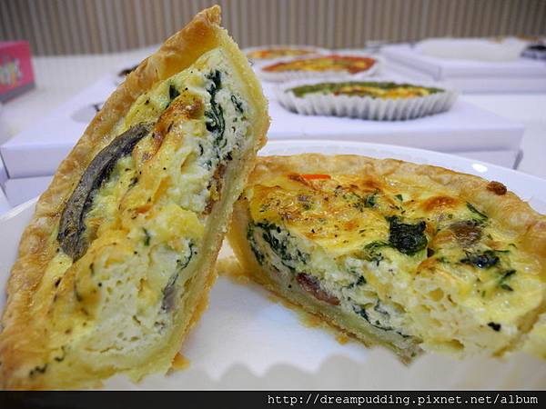 手工鹹派目前有大鹹派跟小鹹派,8吋大鹹派價格為780元,小鹹派一盒四入,依派皮口味價位在400~450元之間。內餡都是菠菜培根。