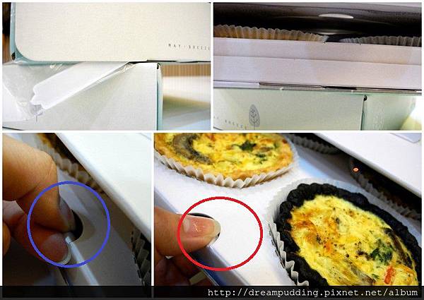 盒身還有貼心小設計,有個隱藏小半圓壓,壓下它就能輕易的把小鹹派從盒子裡拉出來。
