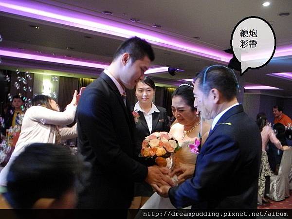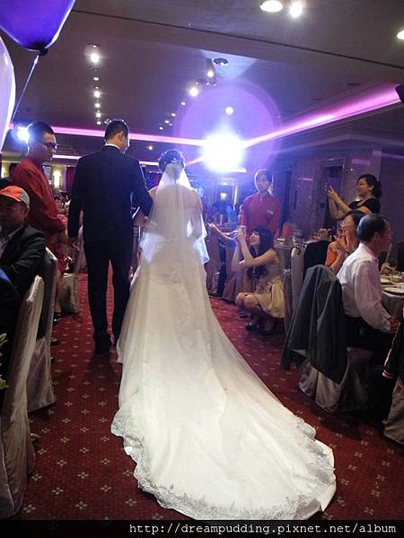 在閒話家常的時候,新郎新娘要進場了,一樣先是服務生進場,再來是新郎,接著是新娘的爸爸牽著新娘進場。