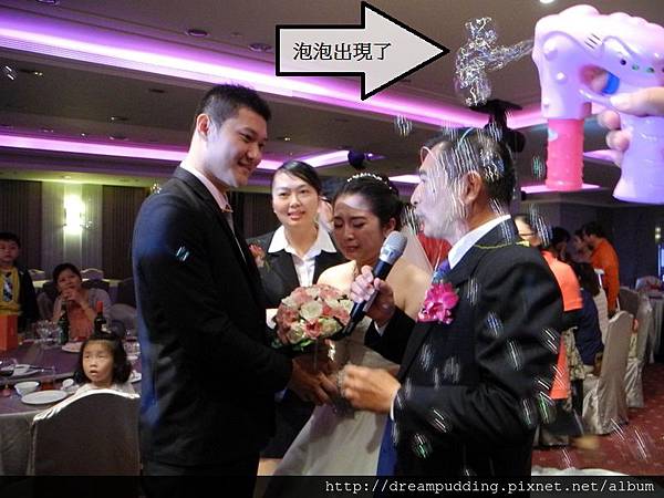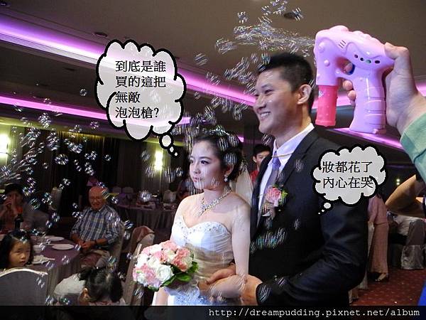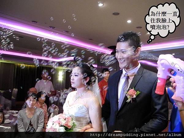 我在旁邊拍照一直喬角度,一方面要拍新人,一方面要閃泡泡,還要笑,我只是想拍張照而已,怎麼累到像在表演凌波微步?然後那個拿著泡泡槍的小弟弟就像噴上癮似的,很瘋狂的一直往新人臉上噴泡泡,還一直笑。