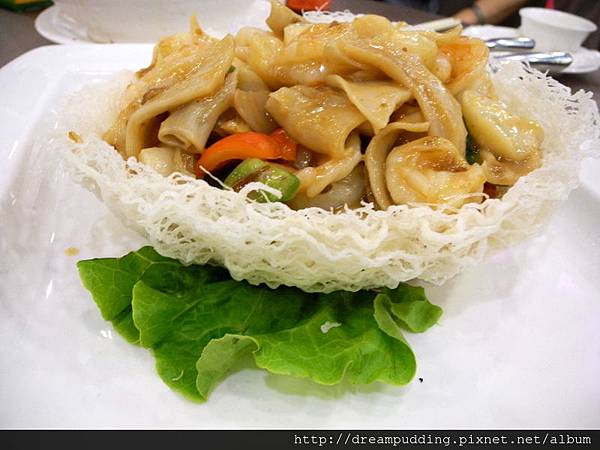 XO醬米網燴雙鮮,很特別,用米粉當碗來裝餐,有大蝦仁跟Q彈的蚌類,鮮甜好吃。