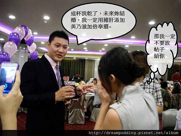 宴客到一半當然就是還江湖債的時候了,新郎很辛苦,要沿桌喝加料的酒,這時刻真恐怖,沒辦法,出來混總是要還的~