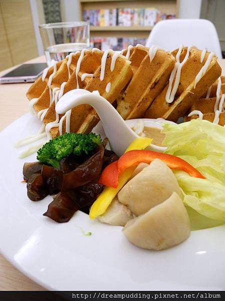 德國香腸鬆餅,還附了小沙拉,有水煮木耳、杏鮑菇跟生菜,都很低熱量來著。