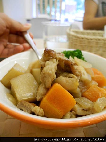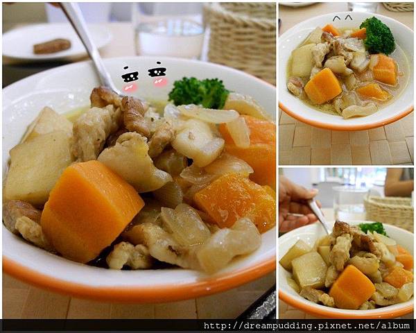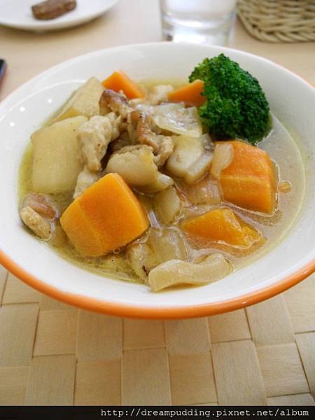料很多,滿滿的一碗,馬鈴薯跟紅蘿蔔都是大塊切來著,但吃起來不會有苦味,連我害怕的紅蘿蔔草味都沒有,一問之下才知道,原來紅蘿蔔是自家種植的。