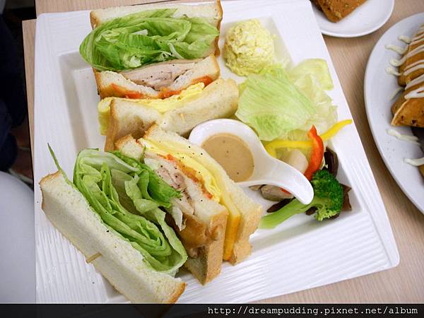 三明治的份量豐富,生菜吃起來也脆,雞肉很嫩,搭著一起吃口感很不錯;而吃的時候感覺到的自然微酸則來自於三明治內層的自製優格,所以上桌後要趕緊吃,我個人喜歡創新吃法,所以很喜歡嘗試新東西,如果你不大能接受嫩雞腿跟優格搭的話,不想抹上優格的話,點餐時記得跟服務人員說喔!