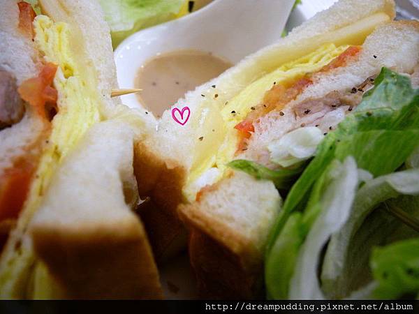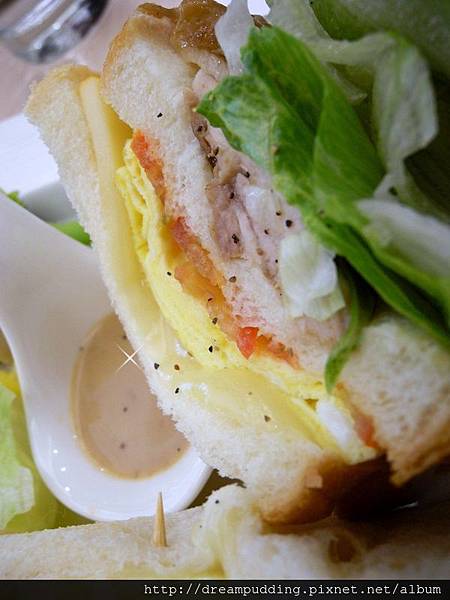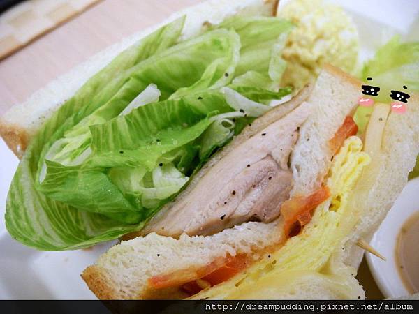 麵包採用台中知名的麵包店,果然吃起來不會乾柴,口感自然蓬鬆帶軟;三明治裡包了一整片起士、蛋、番茄、雞腿肉跟生菜。