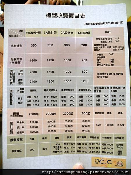 造型價格依設計師、頭髮長短及受損程度下去分類。我這次的設計師CC是特級設計師,所以記得要預約阿,臨時來要很碰運氣的!