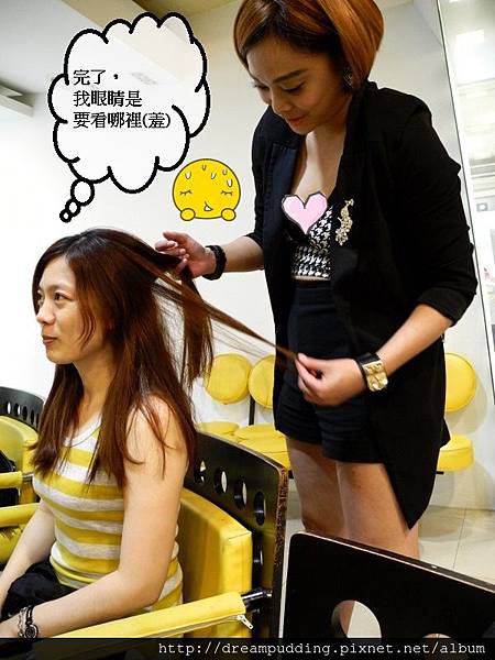 一開始設計師會先詢問你今天想染燙或是剪髮,然後評估你的髮質在看要進行哪一類型的染燙或是修護,進行溝通,是說CC的身材火辣,讓我眼睛不知道該往哪放,雖然我很想放她的性感照片來為我的格友謀福利,但是我覺得她是個很專業的設計師,為了不讓大家模糊焦點,所以我就幫他打上馬賽克啦>////<。