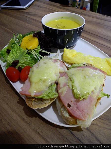手工麵包套餐,附沙拉、湯還有蛋。是說這天供應的是南瓜濃湯,超香濃甜的,我們大家都很喜歡,很推!
