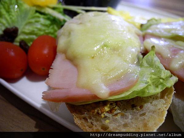 有著嚼勁卻樸實的手工麵包抹上了酸鹹的芥末子,搭上生菜跟火腿鋪上起士下去烤,整體口感很豐富多層次。