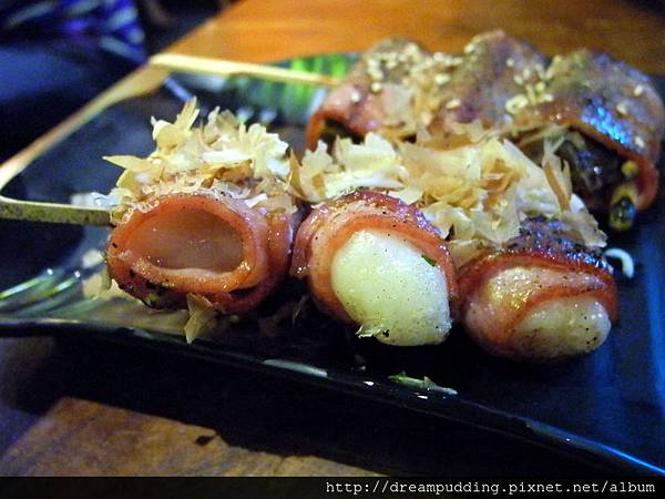 培根皮蛋,培根裡包著切片皮蛋跟蔥,口味比較重,口感也很多重的獨特,吃起來QQ的,算不錯吃,可惜對我來說感覺略閒了一些些。