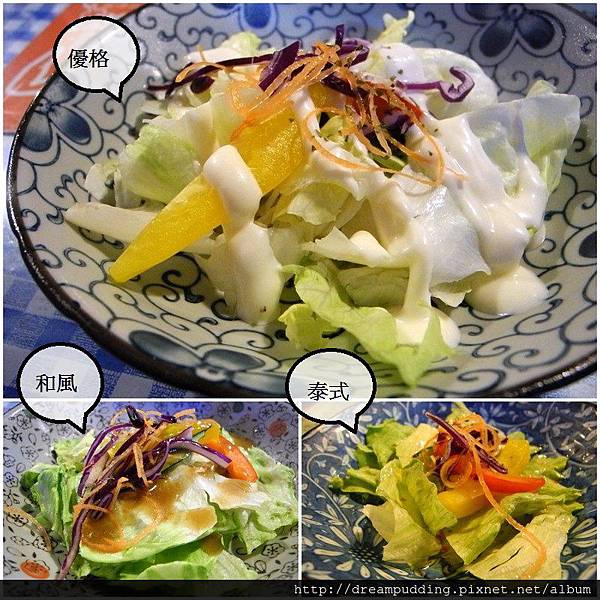 餐點大多200上下,有的才100多元而已,還有附沙拉、湯跟飲料,一整個就是划算到了極點。沙拉醬有優格、泰式跟和風可以選,雖然是簡單的幾片生菜跟甜椒但就這個價格來說,我覺得很超值了。