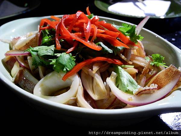 墨魚是每天採買,客人點了之後,才現宰現料理,所以口感很新鮮,微Q微彈,帶一點微辣,搭著微辛的洋蔥跟辛口味的紅椒、香菜一塊吃,整體口感很多層次,清爽帶鮮微辣,好吃。